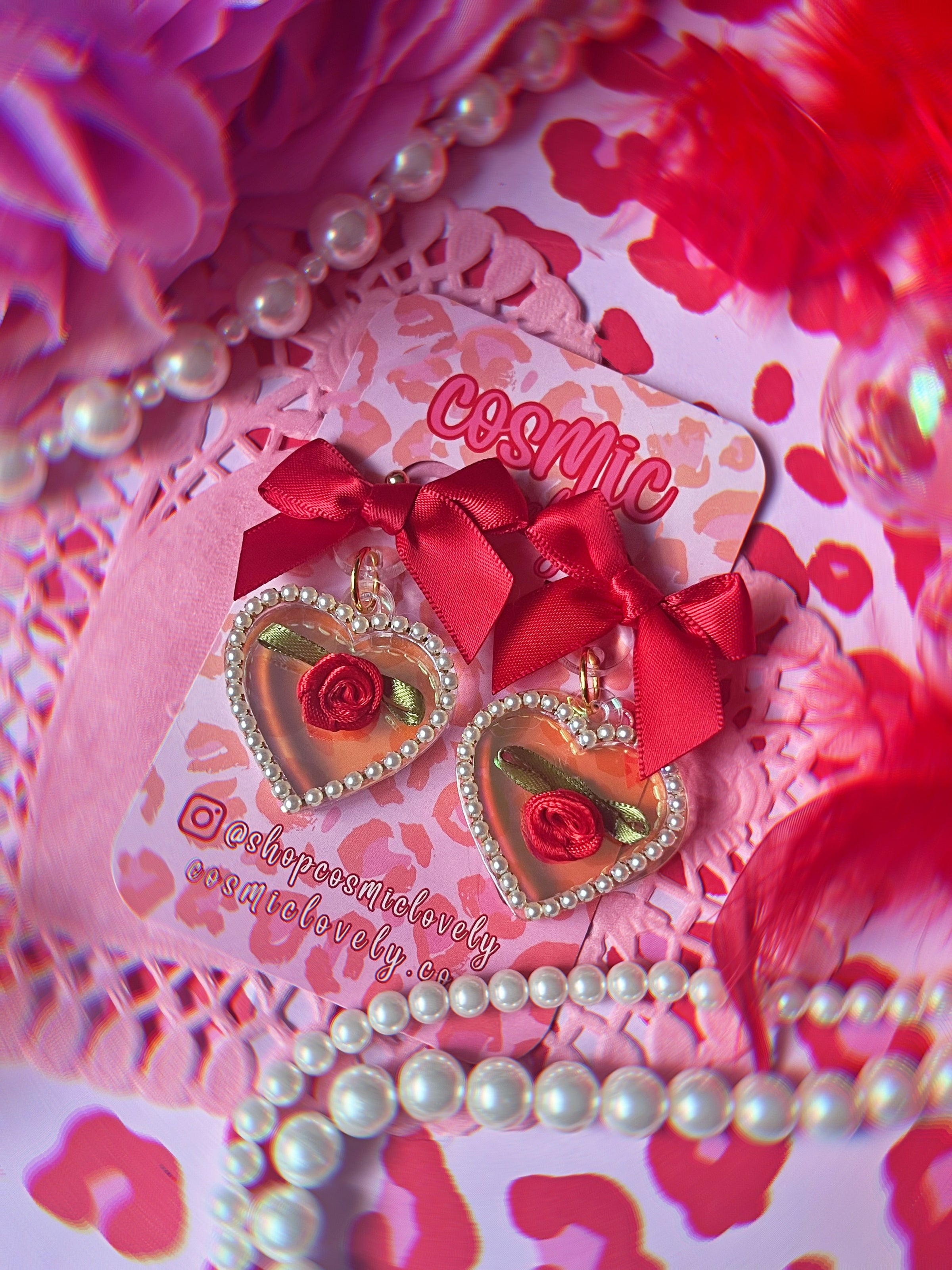 This listing is for ONE Pair of Iridescent Red Bow Coquette Heart Earrings