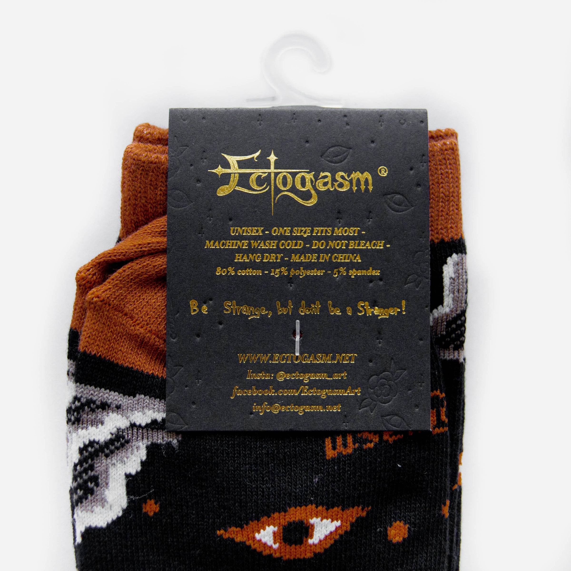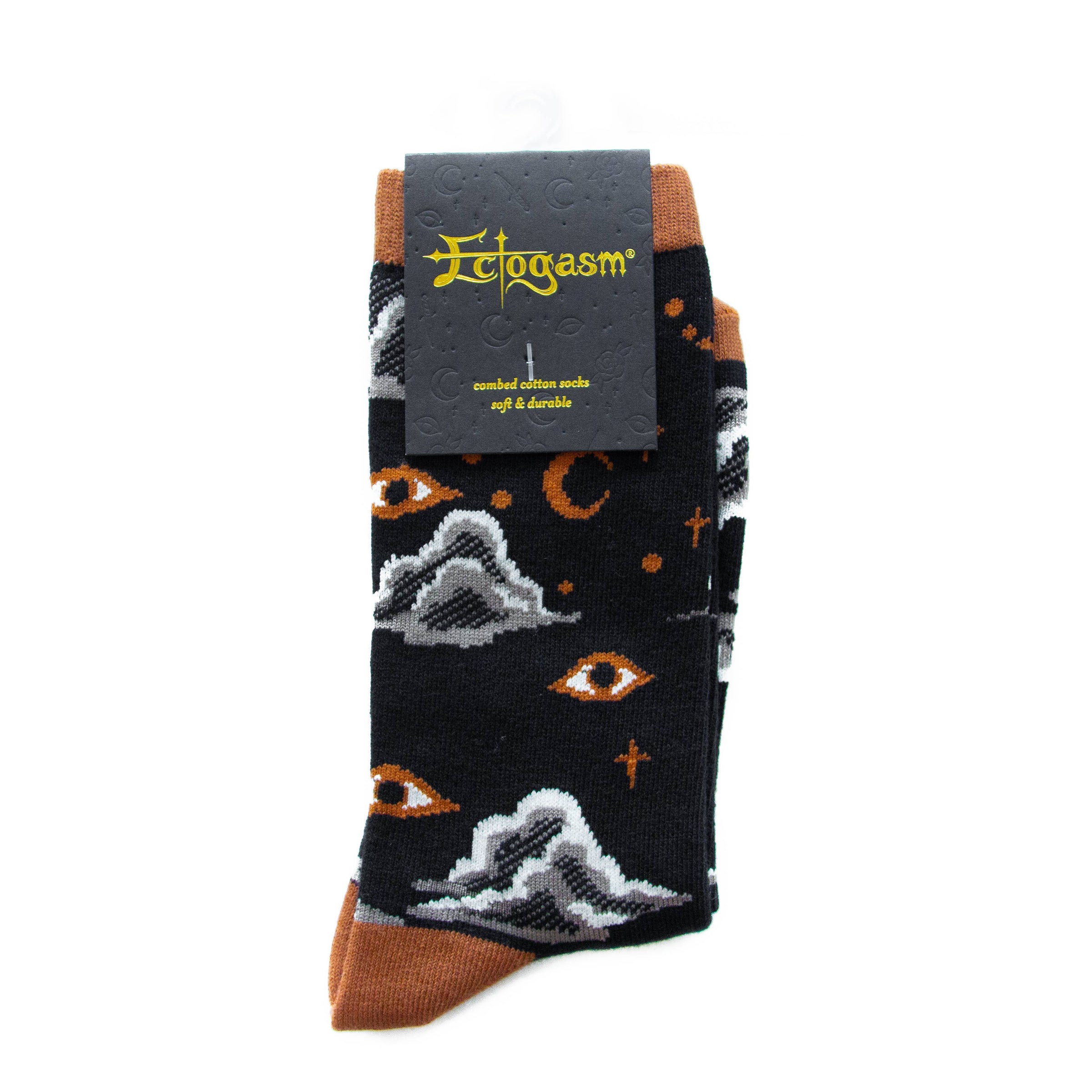An eye in the sky. These socks feature a surreal vision of firmament dotted with thunderheads, stars, and golden eyes that float like flying saucers.