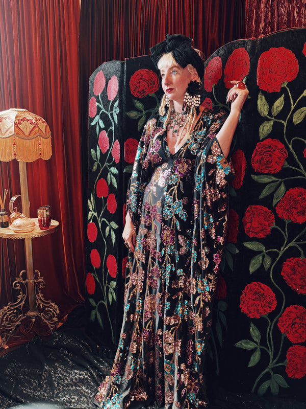 Petrol Black Holographic Sequin Maxi Kaftan Gown / Kimono Robe