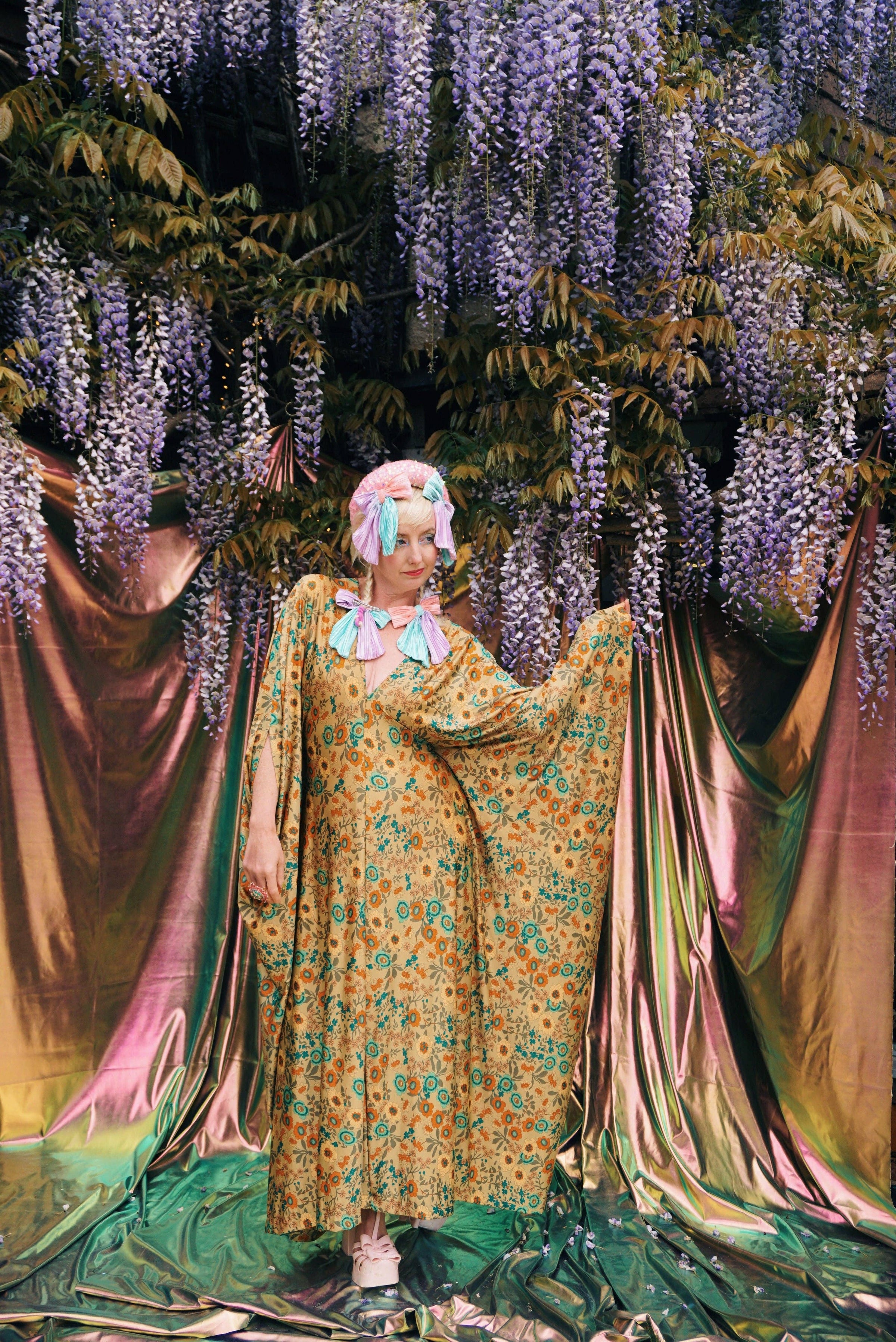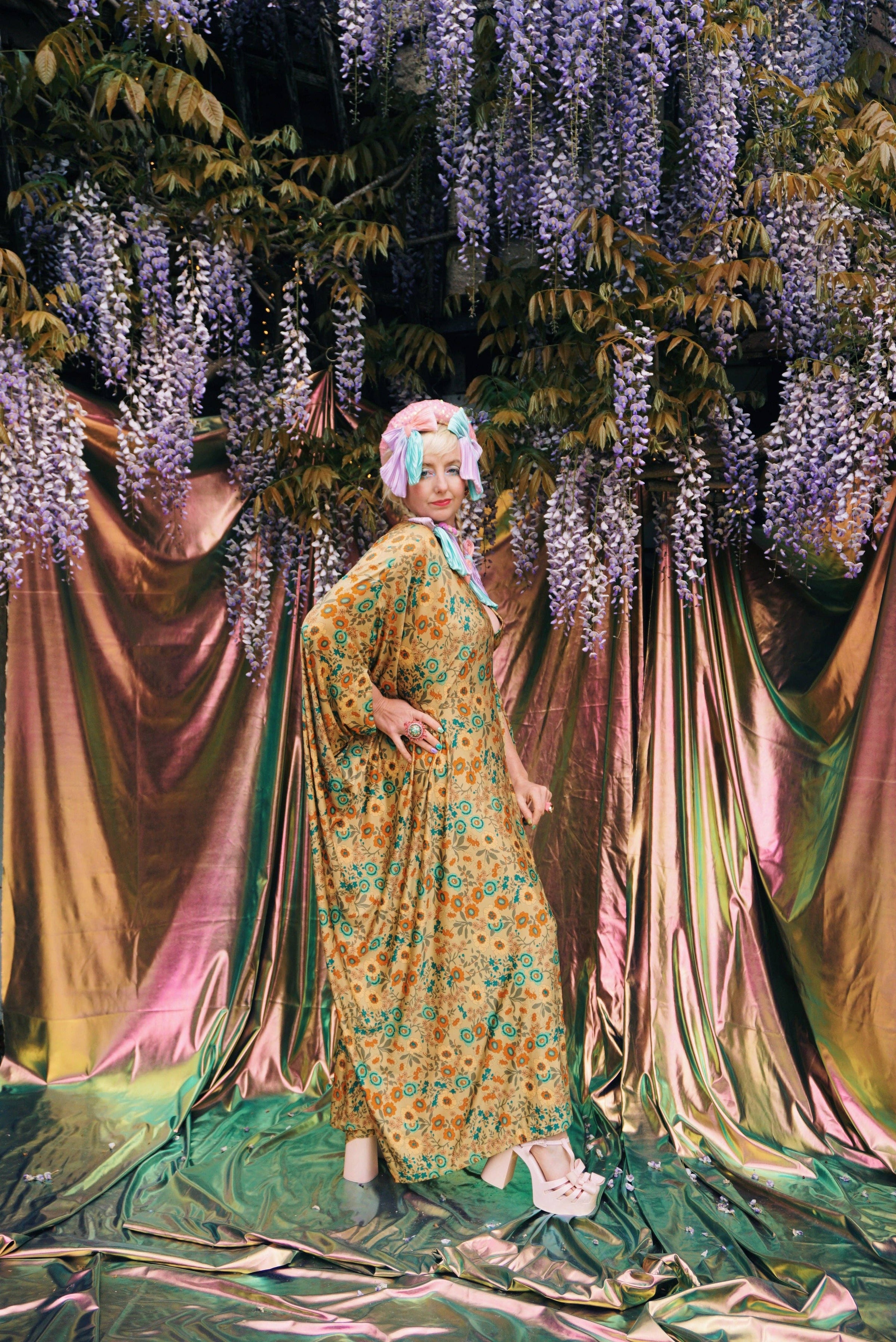 Golden Meadow Print V-Neck Kaftan Gown.