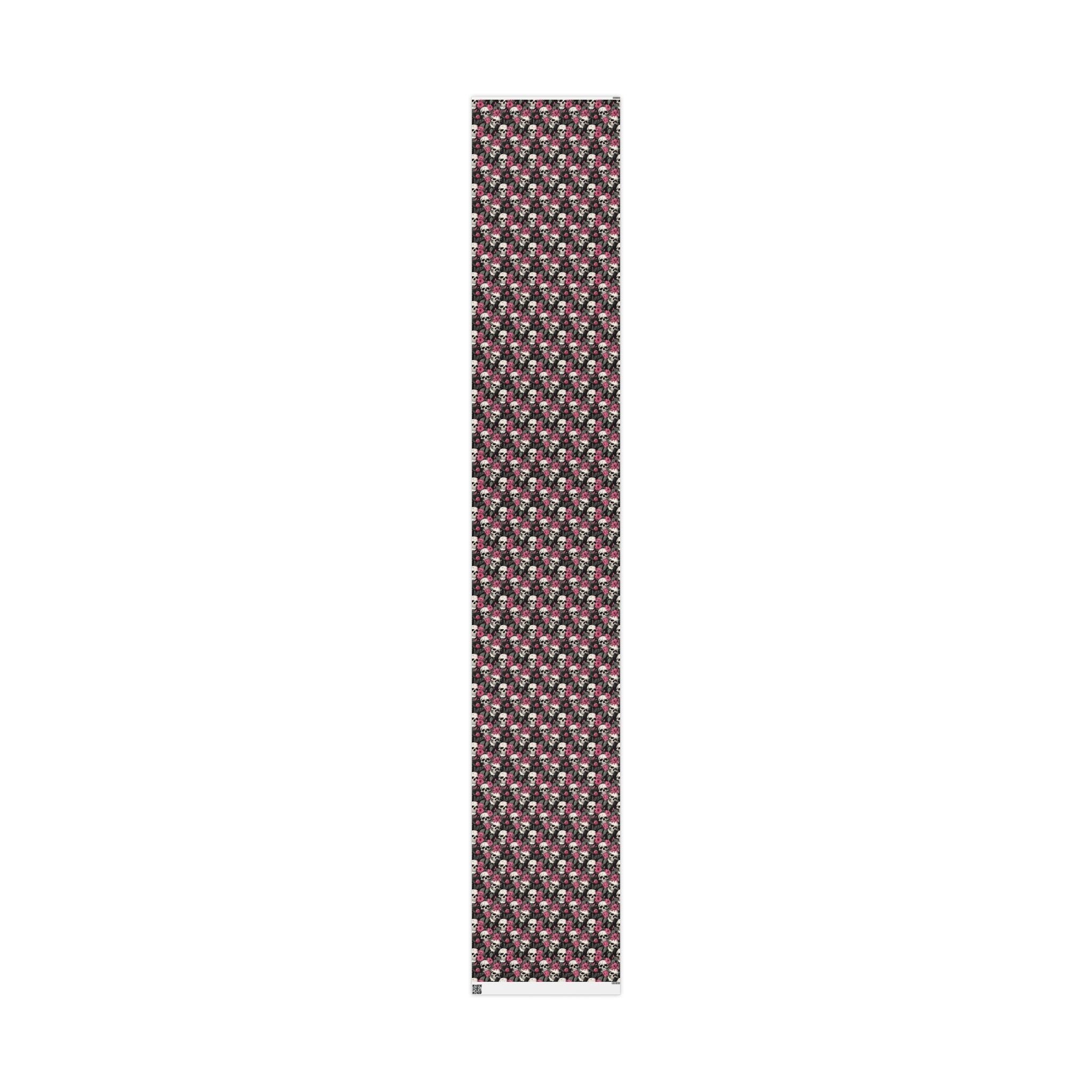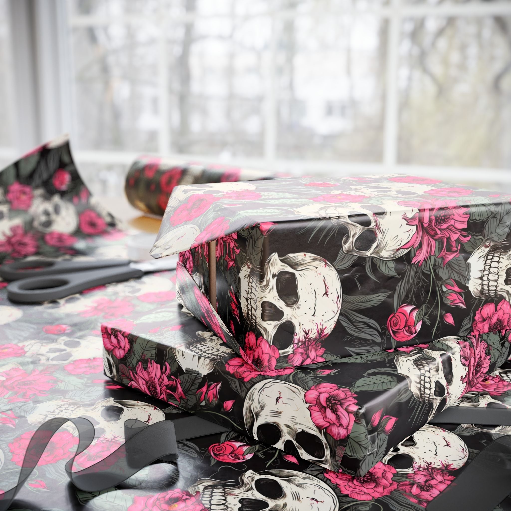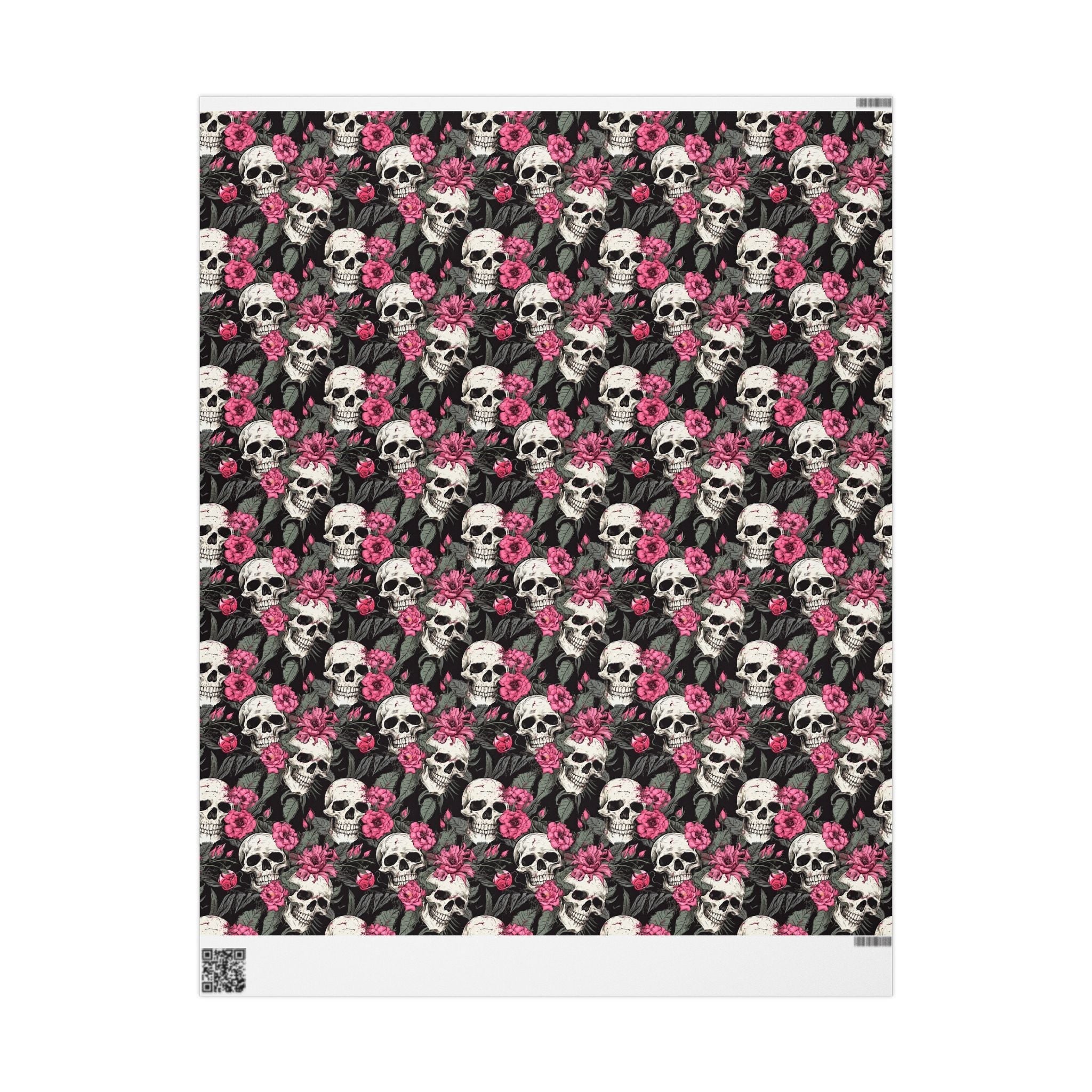 Romantic yet rebellious, our Skull & Pink Floral Gift Wrap features delicate pink roses and grey leaves surrounding detailed skull motifs on a black background. A hauntingly beautiful twist on classic floral design.