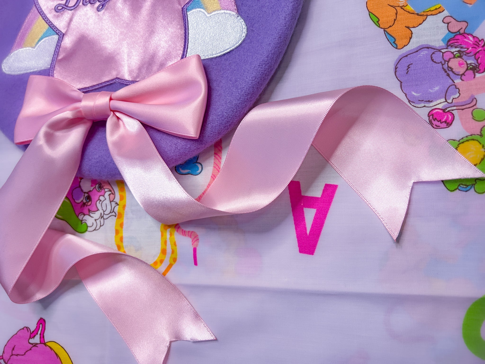 Berets are approximately 10.5 inches across, with a hole diameter of about 5.5 inches. These berets are 100% wool are a "one size fits most" hat. They are made of soft purple wool and feature a charming pink satin embroidered applique. They come with a detachable bow pin, 5.5 inches wide with tails ~11 inches long.