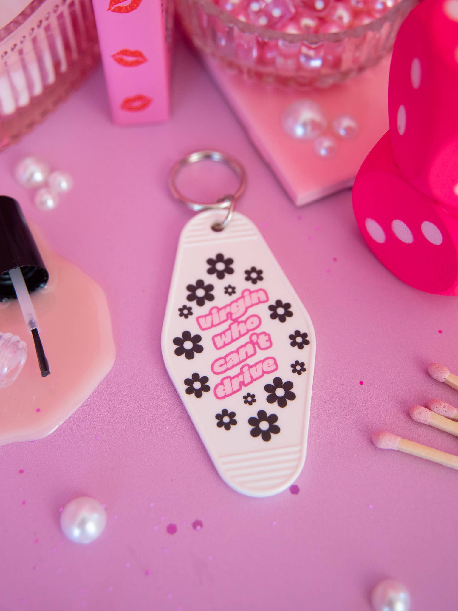 Vintage style motel keychain says Virgin who Can't Drive