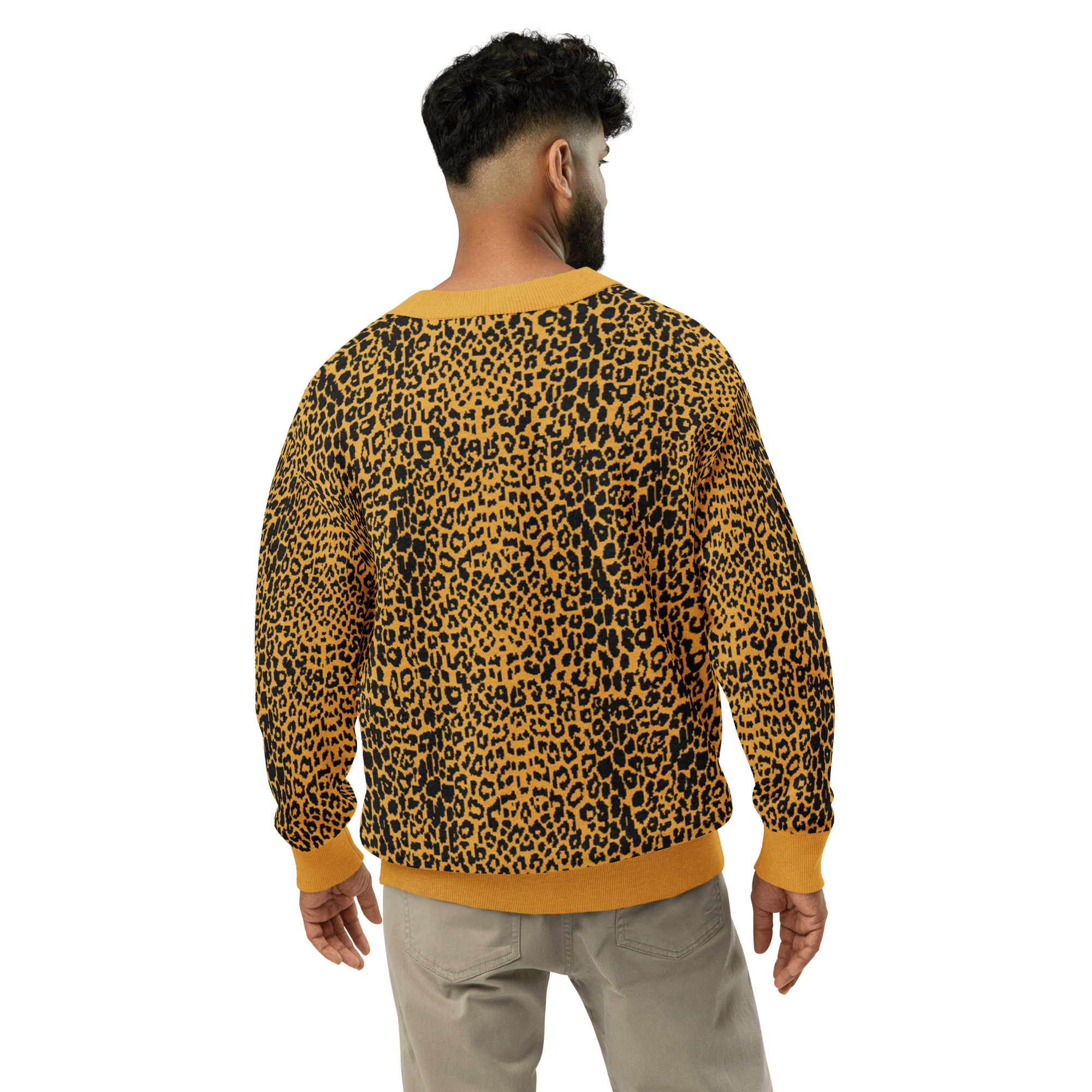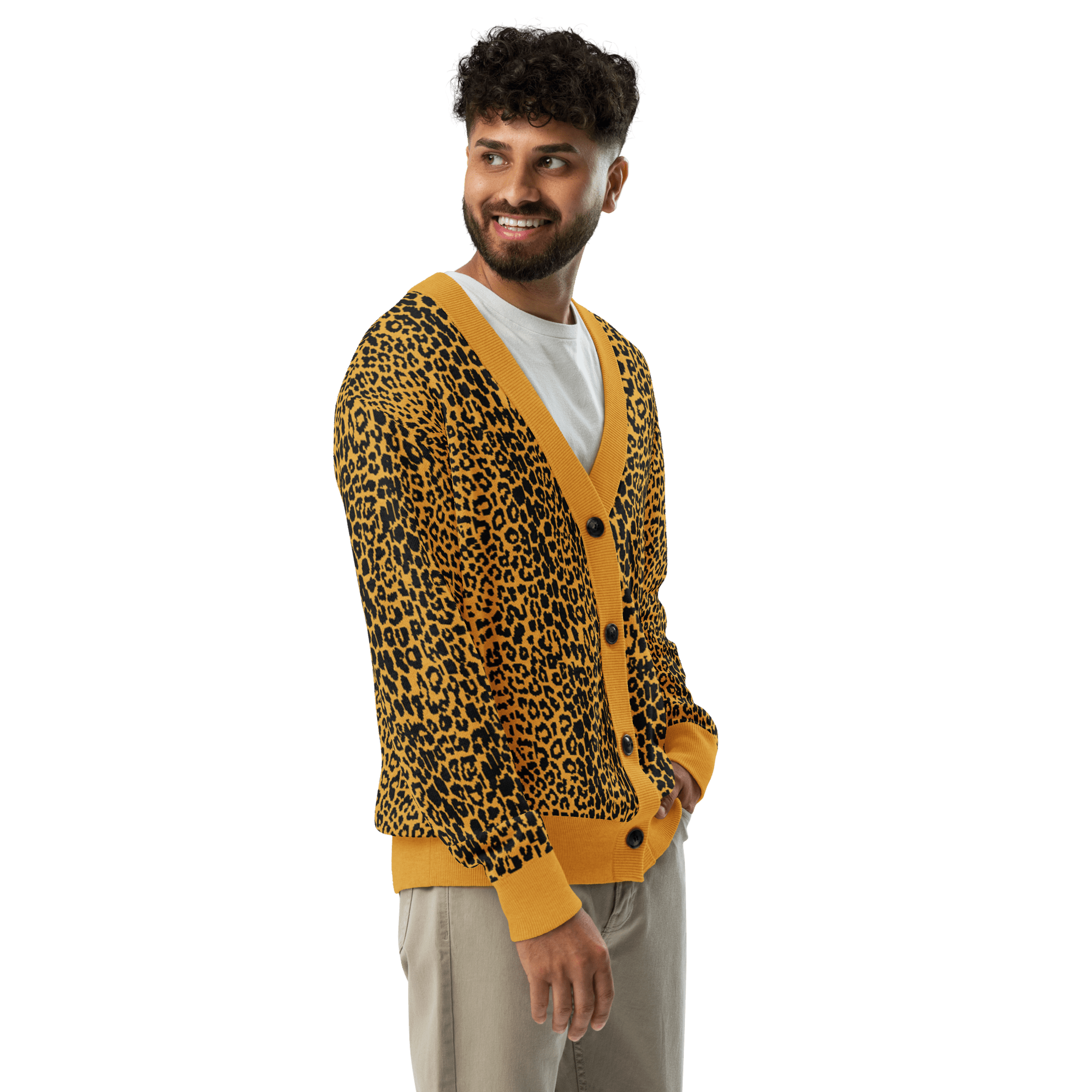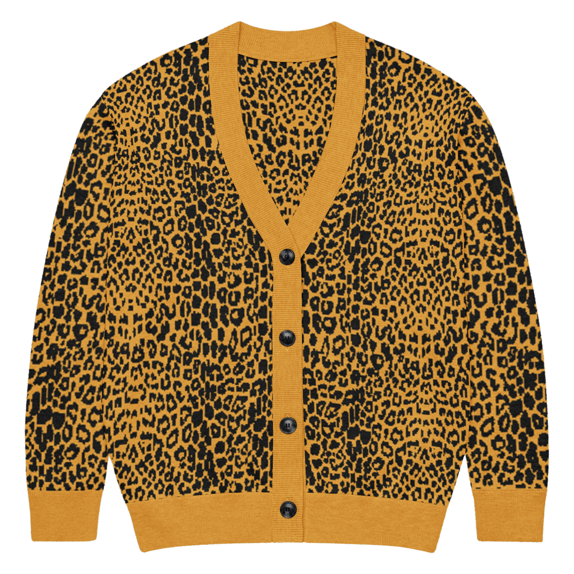 Unleash your wild side with the Fall Feline Knit Cardigan in black and mustard. Designed with a bold animal print jacquard knit, this soft and lightweight cardigan brings gothic edge to a classic leopard pattern. The unisex fit makes it perfect for layering over band tees, dresses, or casual looks, while the cozy cotton-poly blend keeps you comfortable season after season. Add this statement cardigan to your wardrobe for a touch of dark luxury that never goes out of style.