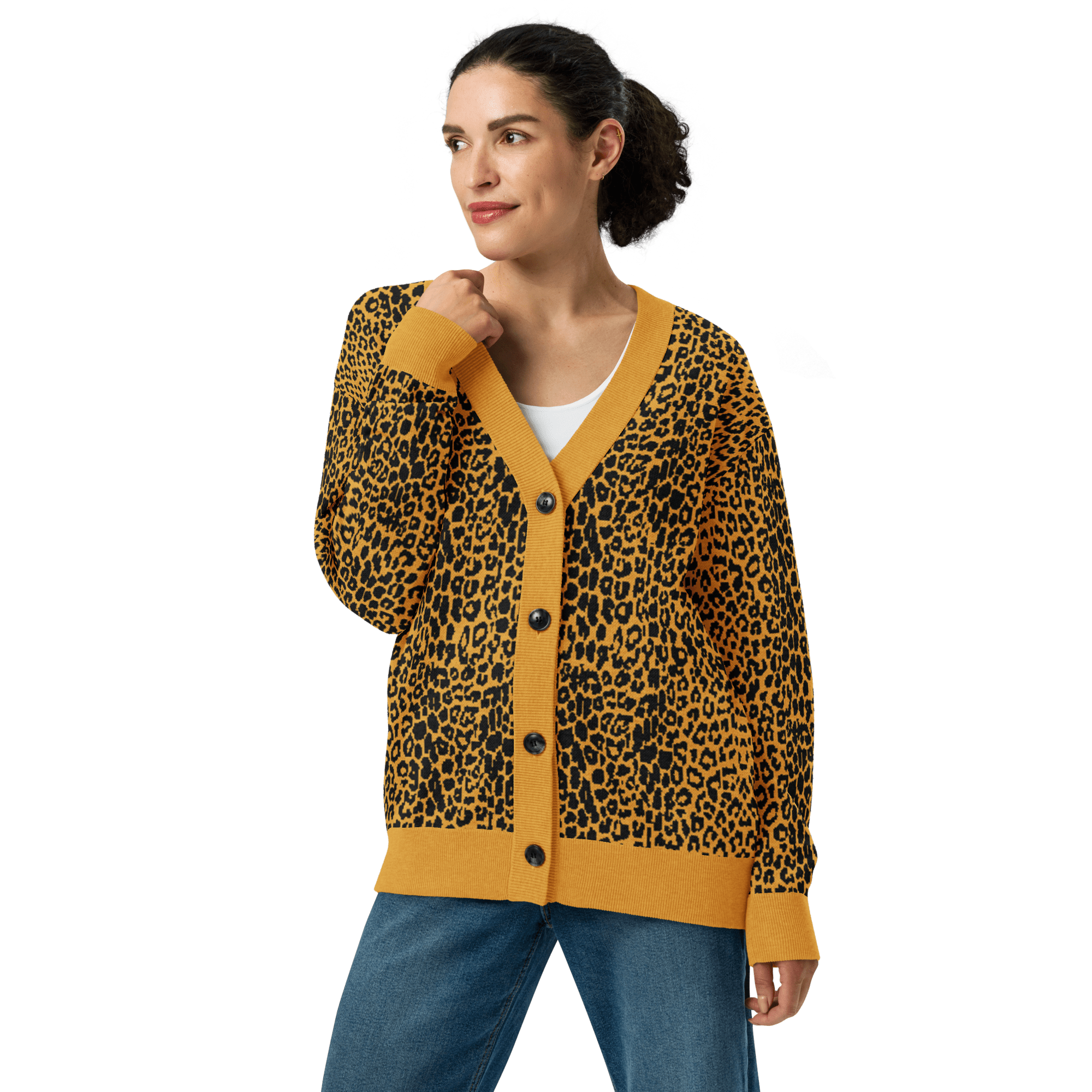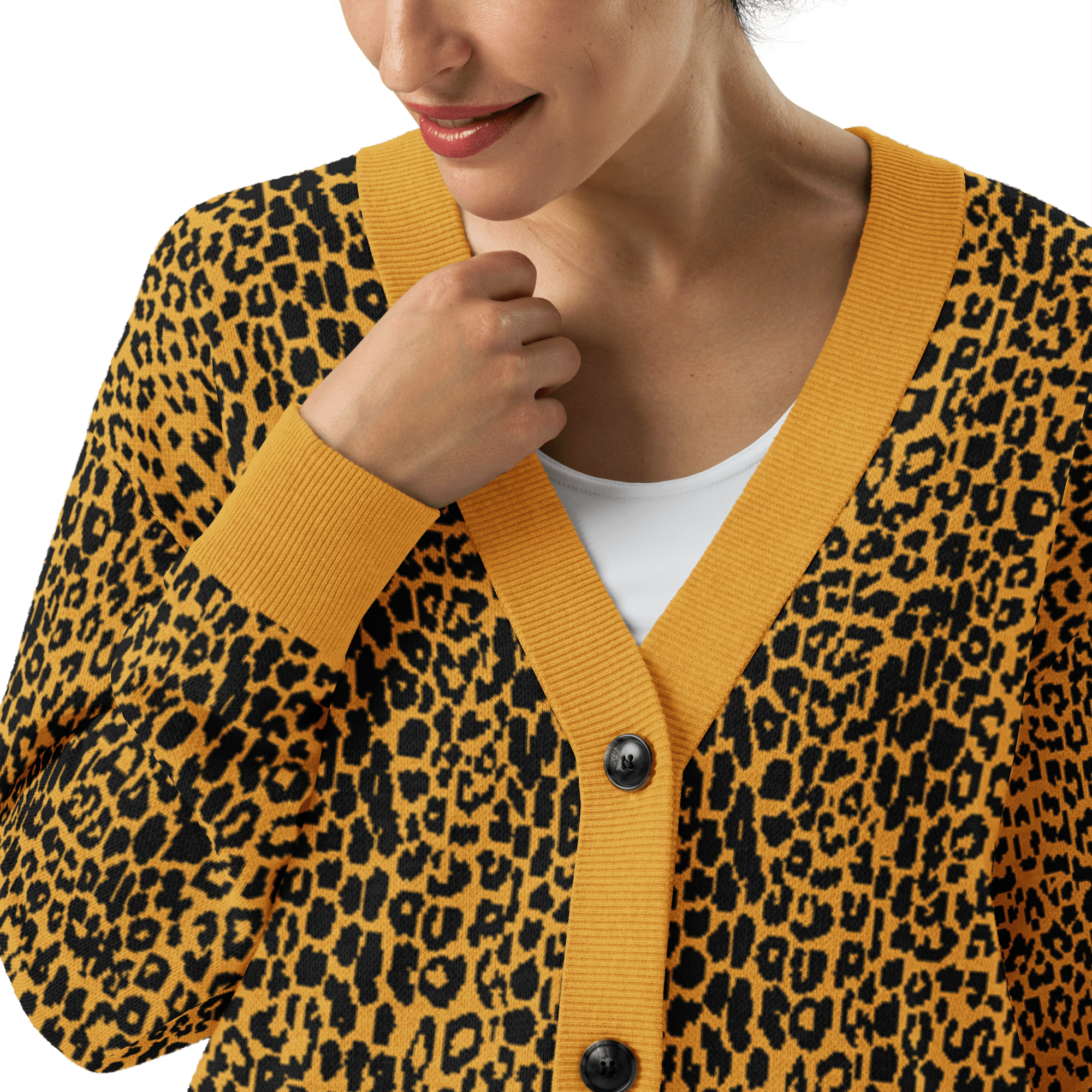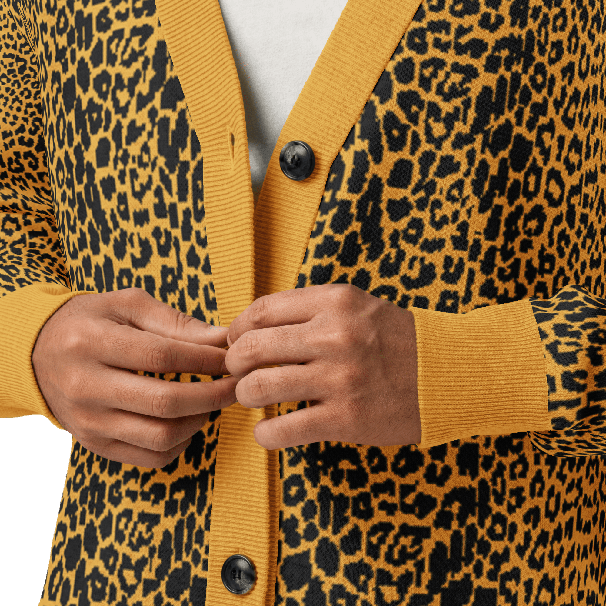 Unleash your wild side with the Fall Feline Knit Cardigan in black and mustard. Designed with a bold animal print jacquard knit, this soft and lightweight cardigan brings gothic edge to a classic leopard pattern. The unisex fit makes it perfect for layering over band tees, dresses, or casual looks, while the cozy cotton-poly blend keeps you comfortable season after season. Add this statement cardigan to your wardrobe for a touch of dark luxury that never goes out of style.