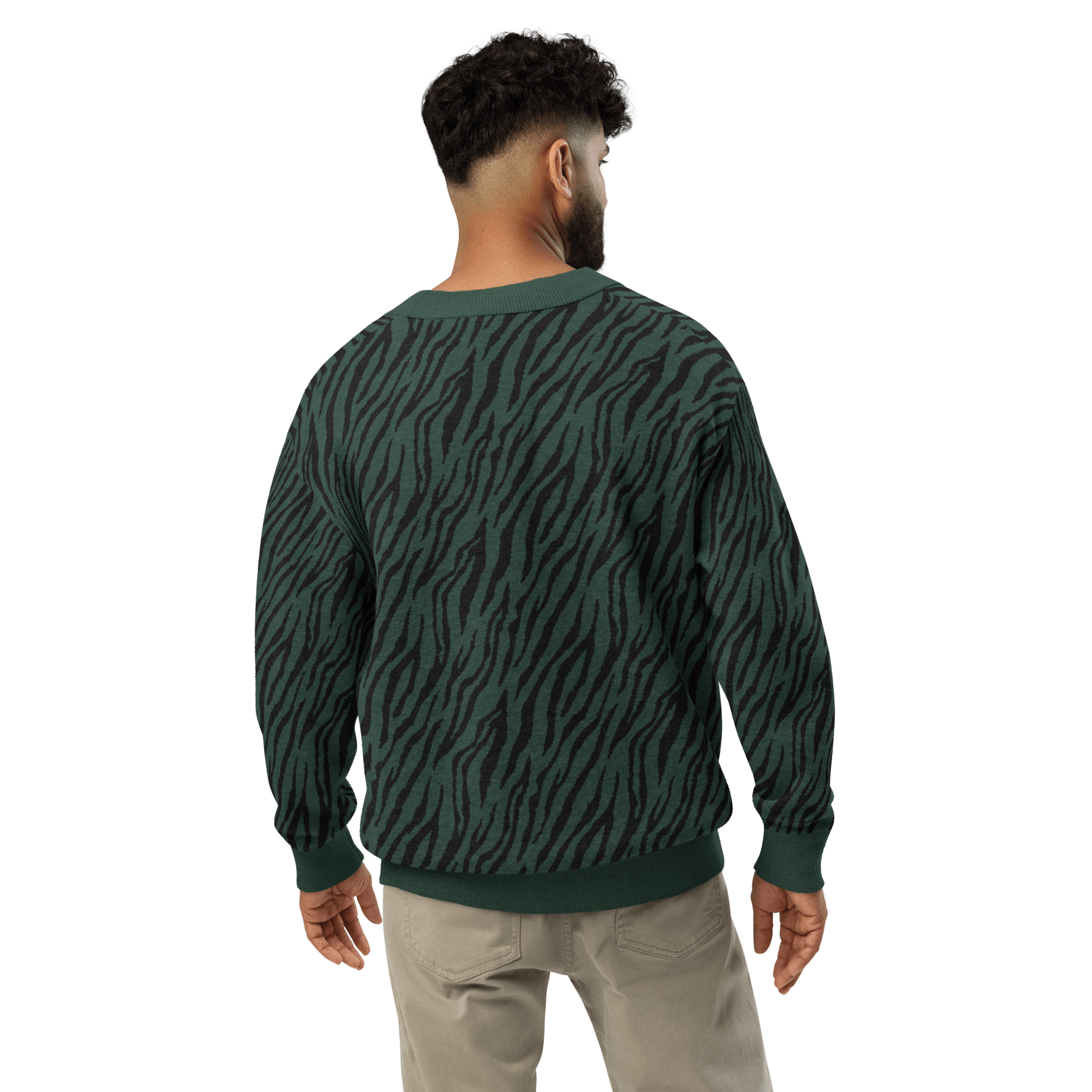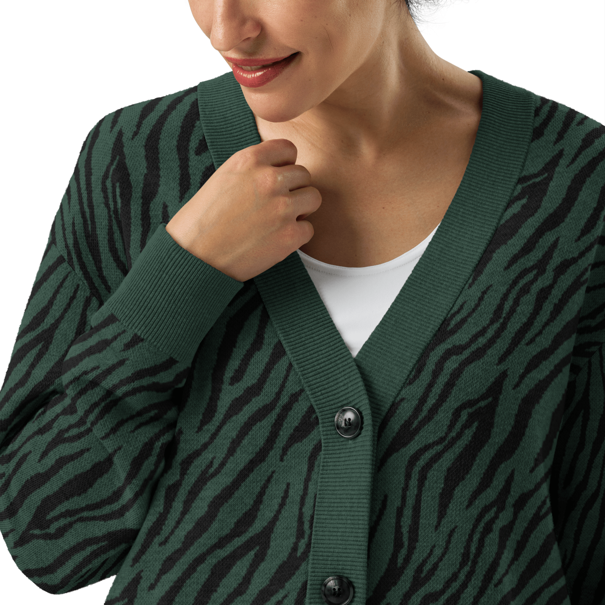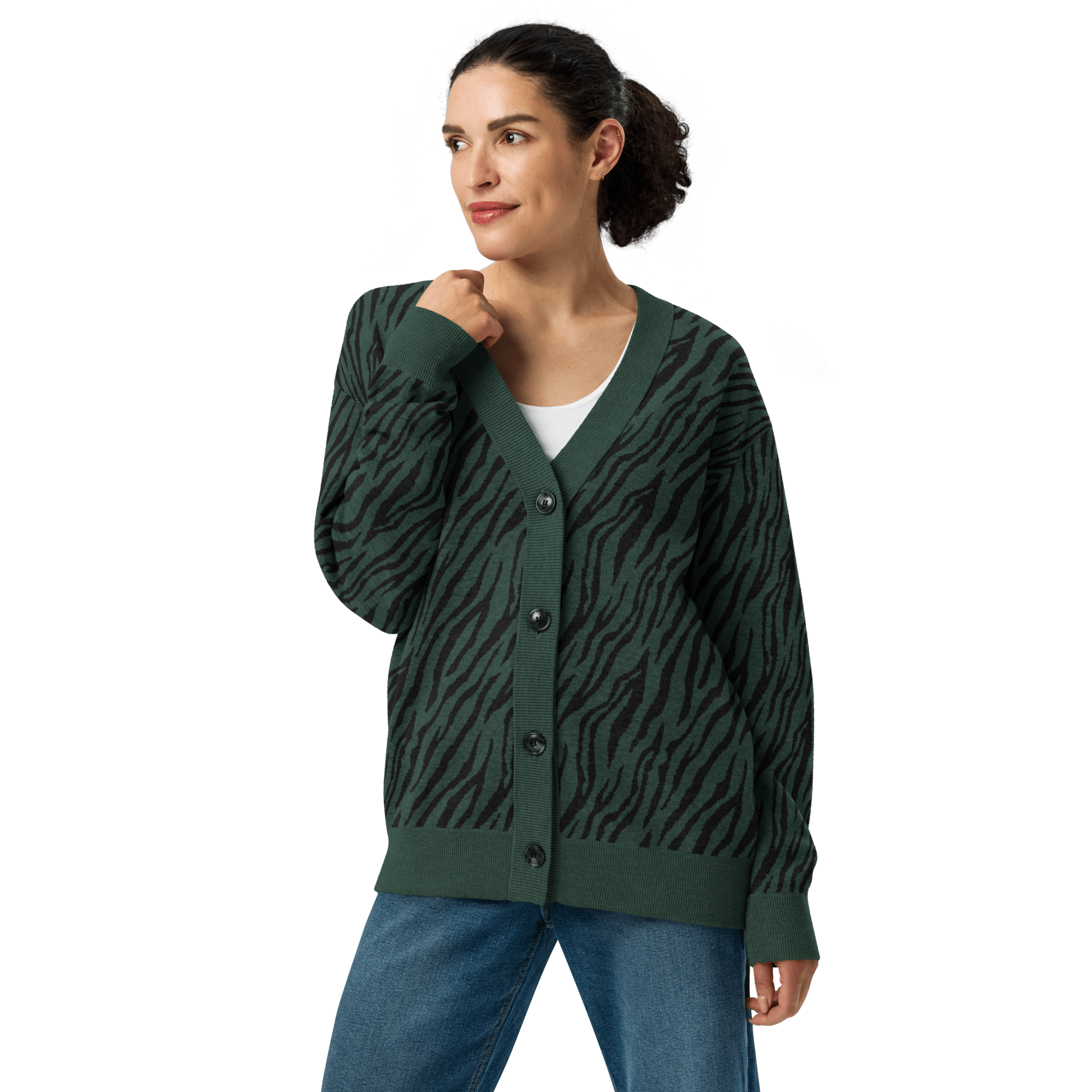 Step into the dark wild with the Predator Pines Knit Cardigan, featuring a striking black and pine green tiger stripe jacquard knit. The rich color palette brings a haunting twist to a classic animal print, making it a standout piece for gothic and alternative wardrobes. Lightweight, cozy, and unisex, this cardigan is perfect for layering season after season. Pair it with ripped denim for a casual punk vibe or throw it over a dress for an elevated gothic look.