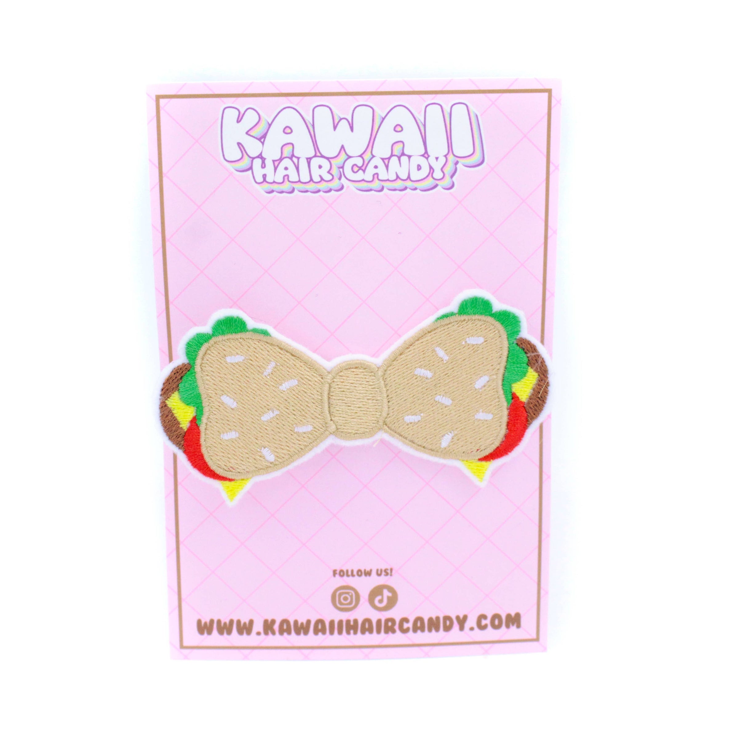 Add a touch of whimsy to your hairstyle with our Super Cute Hamburger Bow Hair Clip! This unique hair clip features a bun-shaped bow adorned with lettuce, tomato, cheese, and ketchup layers, all meticulously embroidered using the highest quality threads. Each detail is hand-drawn and digitized by me, ensuring a delightful and eye-catching accessory. Handmade with love in the USA, this hamburger bow hair clip is perfect for food lovers and those who appreciate quirky accessories. Whether you're attending a summer cookout, celebrating the 4th of July, or just want to add a fun twist to your outfit, this hair clip is sure to stand out. Complete with a metal hair clip sewn to the back, this hamburger bow clip is easy to attach and secure in place. Elevate your style with this handmade accessory, lovingly made in the USA. Use these accessories for an instant update on just about any style! Measures approx. 4" across x 2" high Designed exclusively for Kawaii Hair Candy Made in the USA