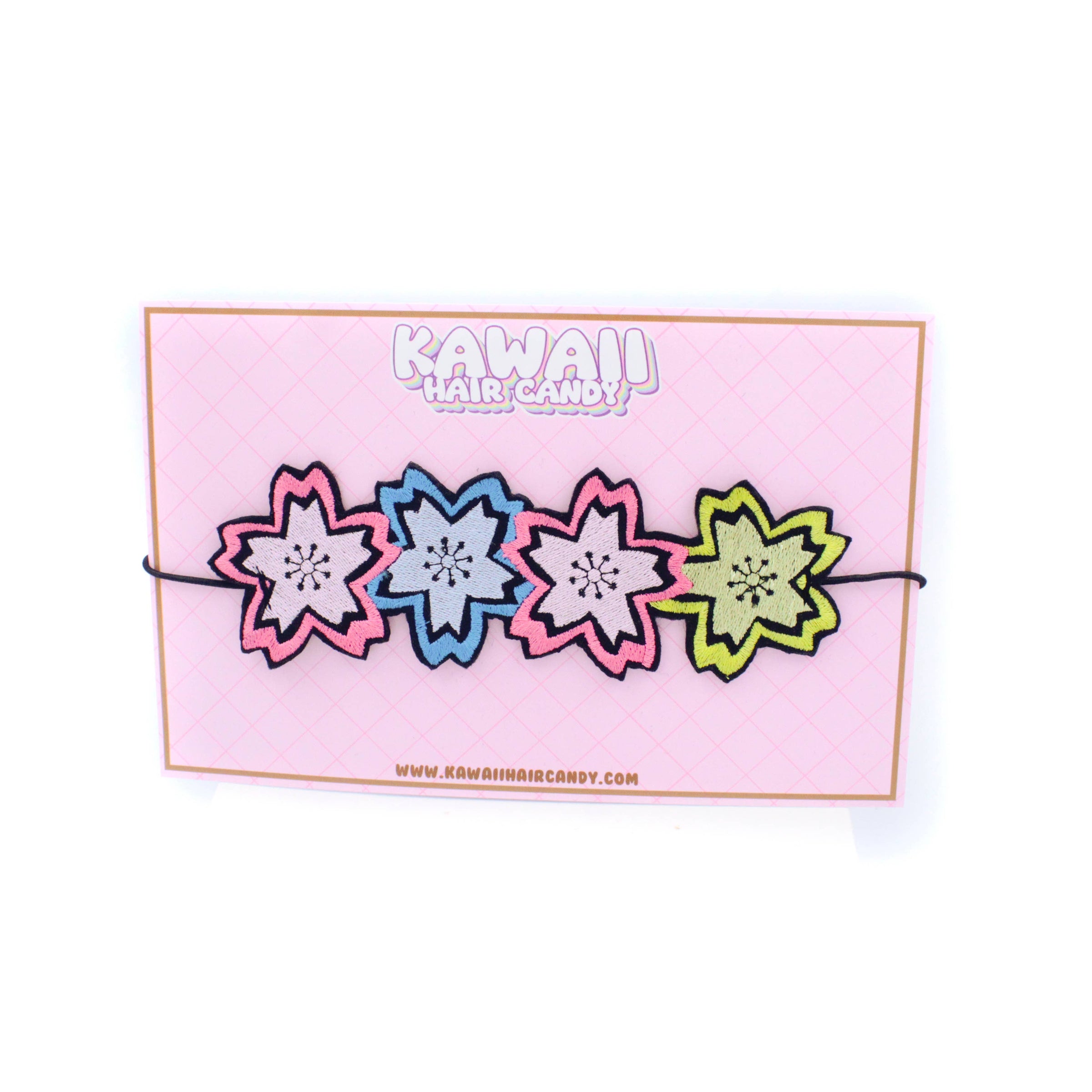 Elevate your hair accessories collection with our unique Pop Art Sakura Blossoms Headband! Handmade in the USA by me in my studio, this headband features four embroidered sakura blossoms in a vibrant pop art style—two in pink, one in blue, and one in yellow. The black elastic cord, securely sewn onto the headband, ensures a comfortable and secure fit.