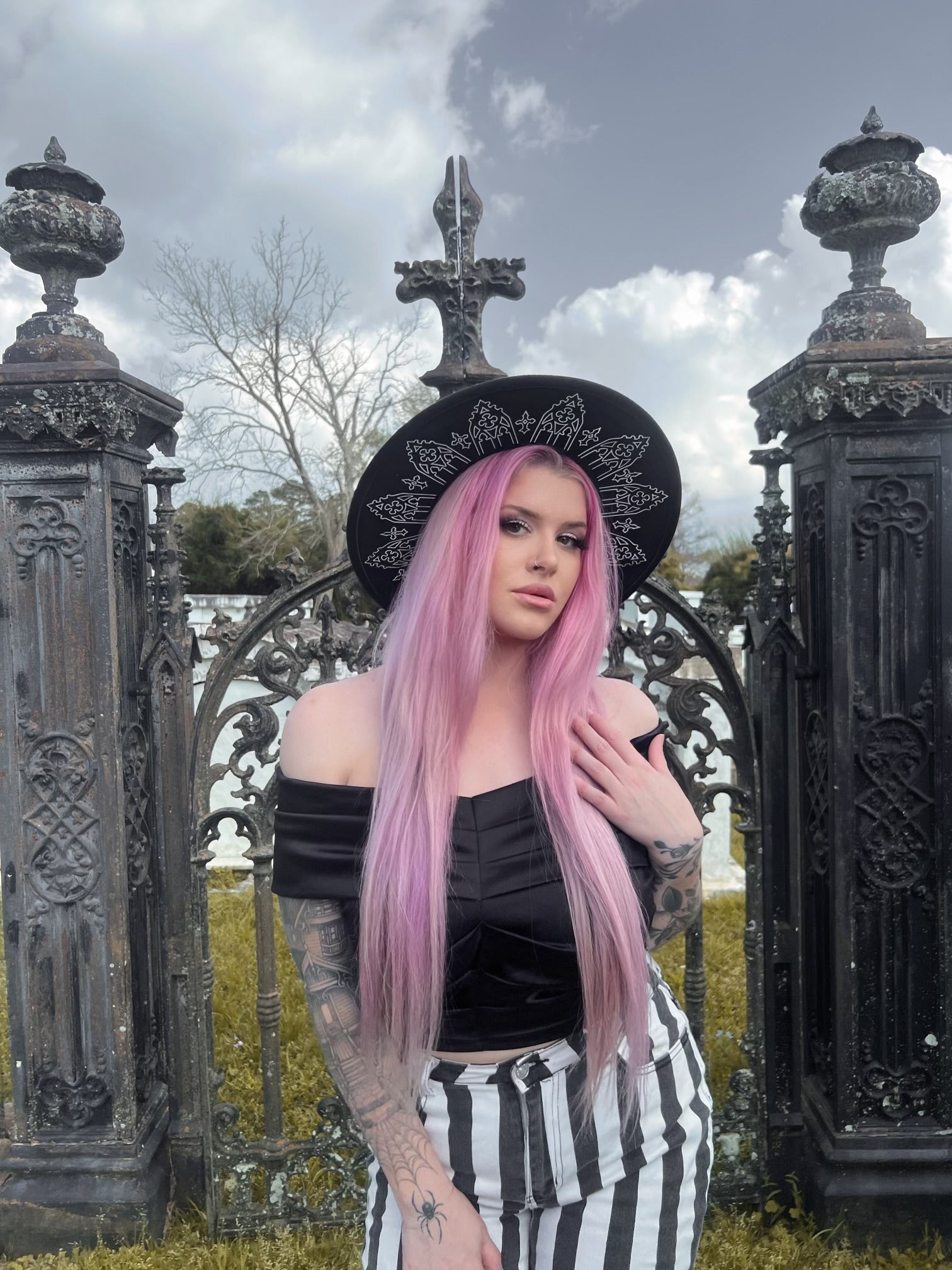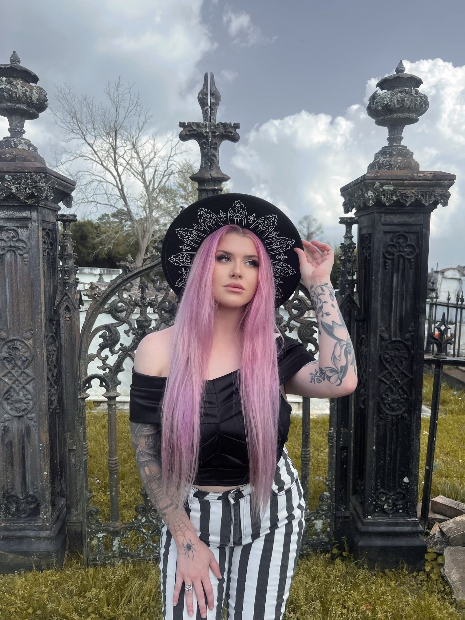 We are so excited with this WITCHWOOD X WITCHVOID collab hat design! The crown design is reminiscent of some of her favorite gothic wrought iron architecture from New Orleans!