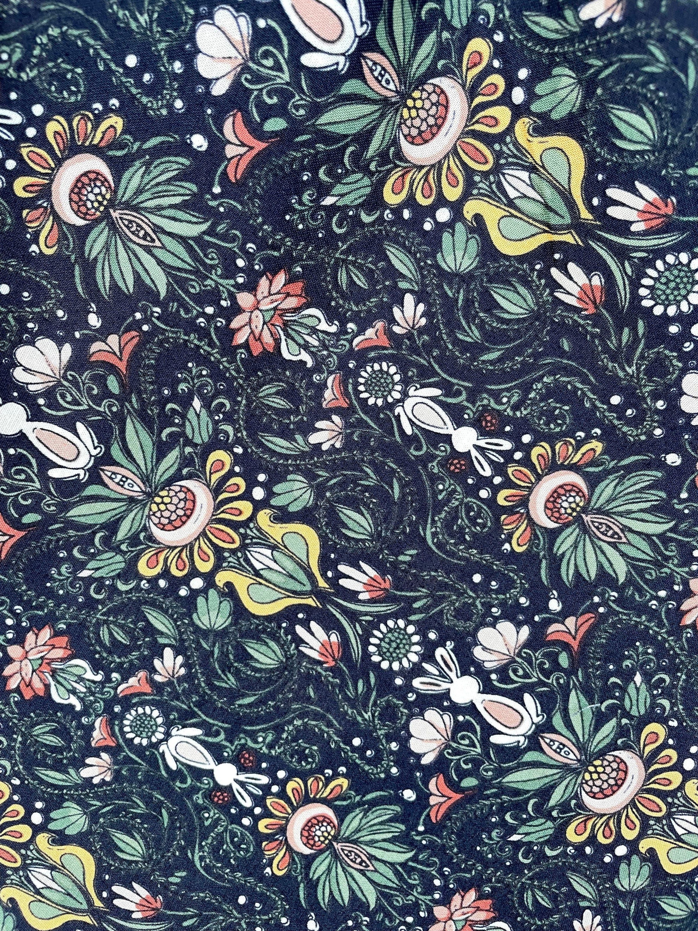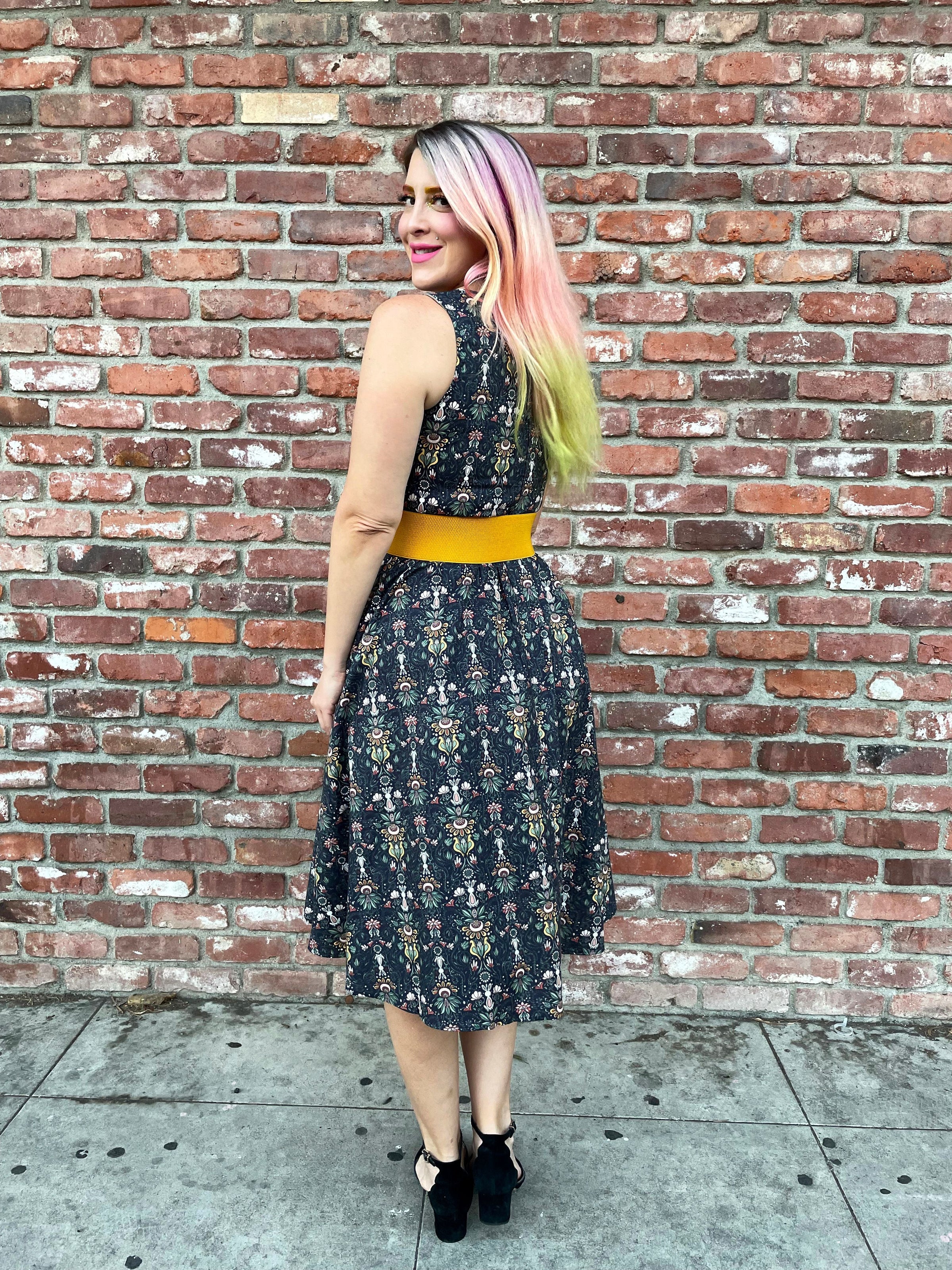 A vintage style piece with fun, modern details; our midi dress is now available in our White Rabbit print.  Made from 100% cotton, this classic 1950's inspired dress features a high neckline, longer length swing skirt with hidden side pockets, and back zippered closure.  Shown with our mustard retro cinch belt.